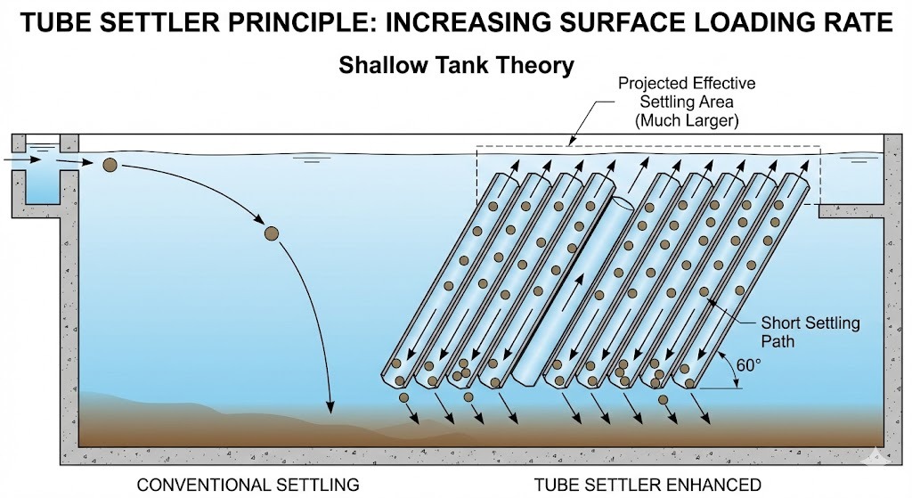 필수 면적 = 설계 유량 / 허용 오버플로율. 일반적으로 튜브 침전지는 튜브가 없는 기존 정화기보다 2~4배 더 높은 오버플로 속도를 허용하여 기존 탱크의 용량을 효과적으로 두 배 또는 세 배로 늘립니다.