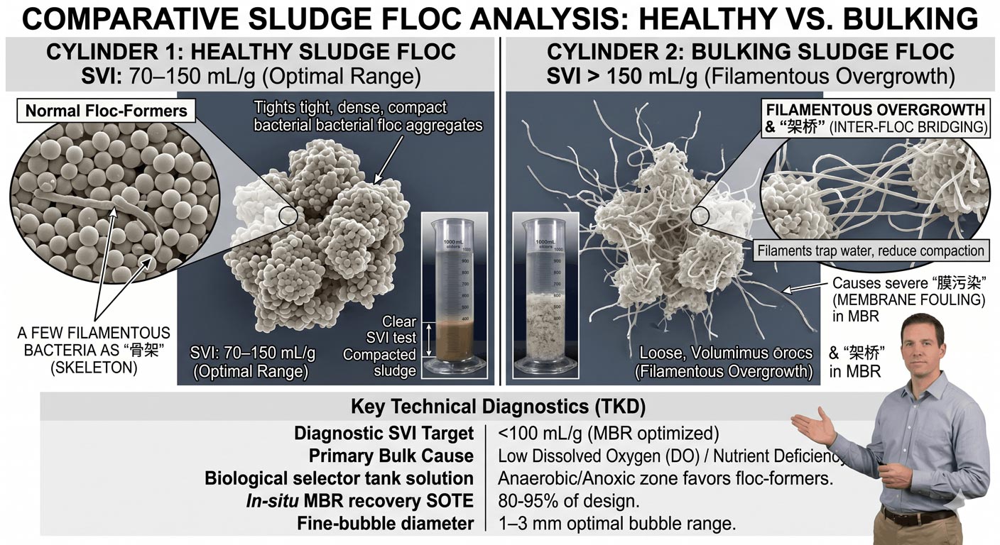 직접적인 답변: 슬러지 벌킹은 활성 슬러지가 2차 정화기에서 적절하게 침전되지 않아 고형물이 폐수로 유입되는 경우를 말합니다. 90% 이상의 사례는 사상균의 과증식으로 인해 발생합니다. 나머지 사례에는 비섬유성 메커니즘, 즉 엑소폴리머 과잉 생산으로 인한 점성 벌킹과 특정 유기산으로 인한 동물원 벌킹이 포함됩니다. 근본 원인은 거의 항상 작동 불균형(낮은 용존 산소량, 낮은 F/M 비율, 영양 결핍 또는 온도 충격)이며 무작위적인 생물학적 사건이 아닙니다.