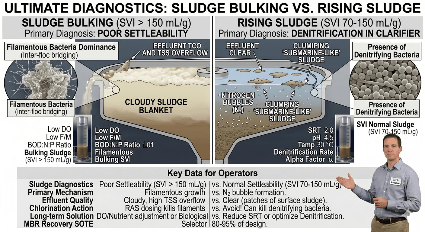 | 주요 원인 | 사상균, 낮은 DO, 낮은 F/M | 정화기의 탈질 (NO₃ 불충분한 DO) |